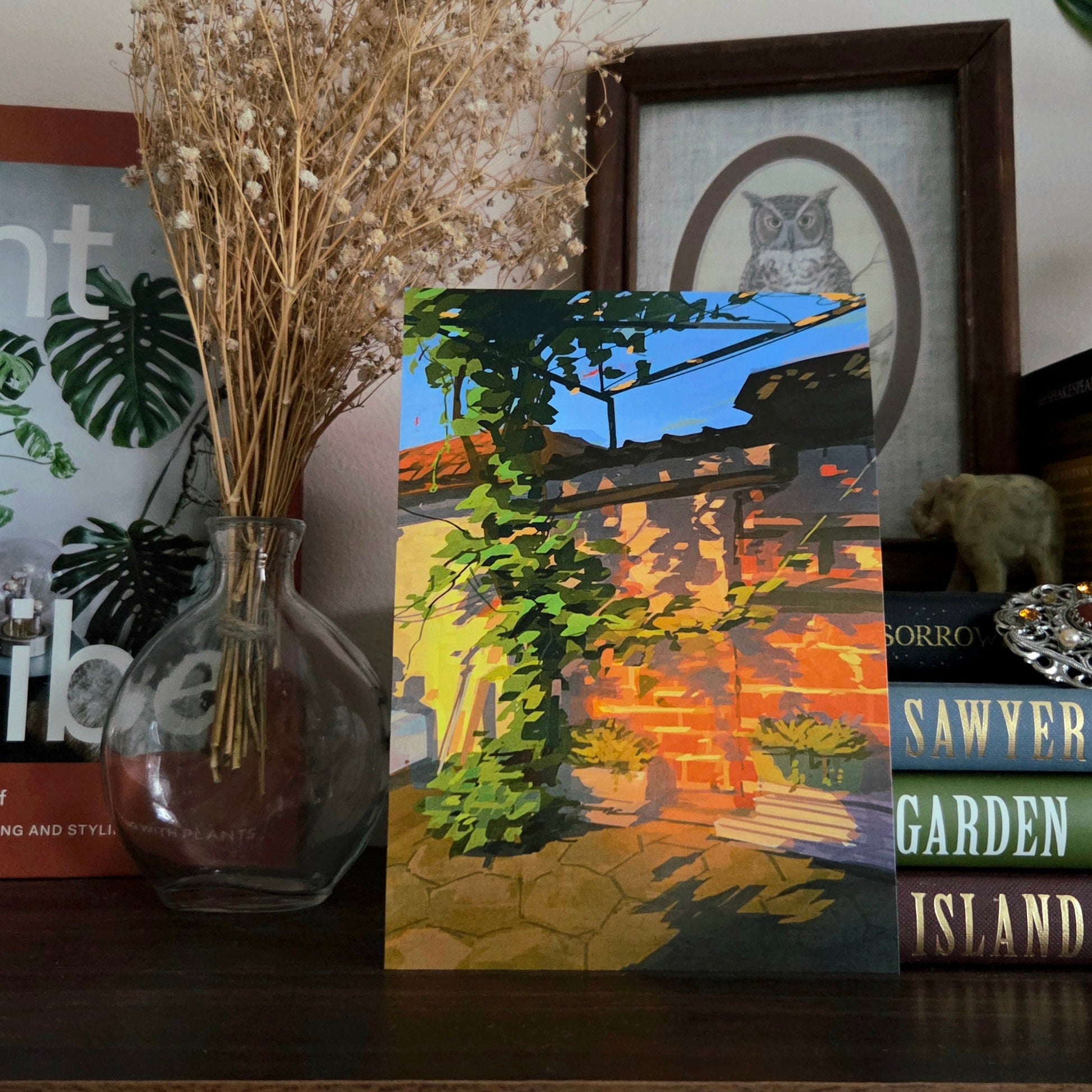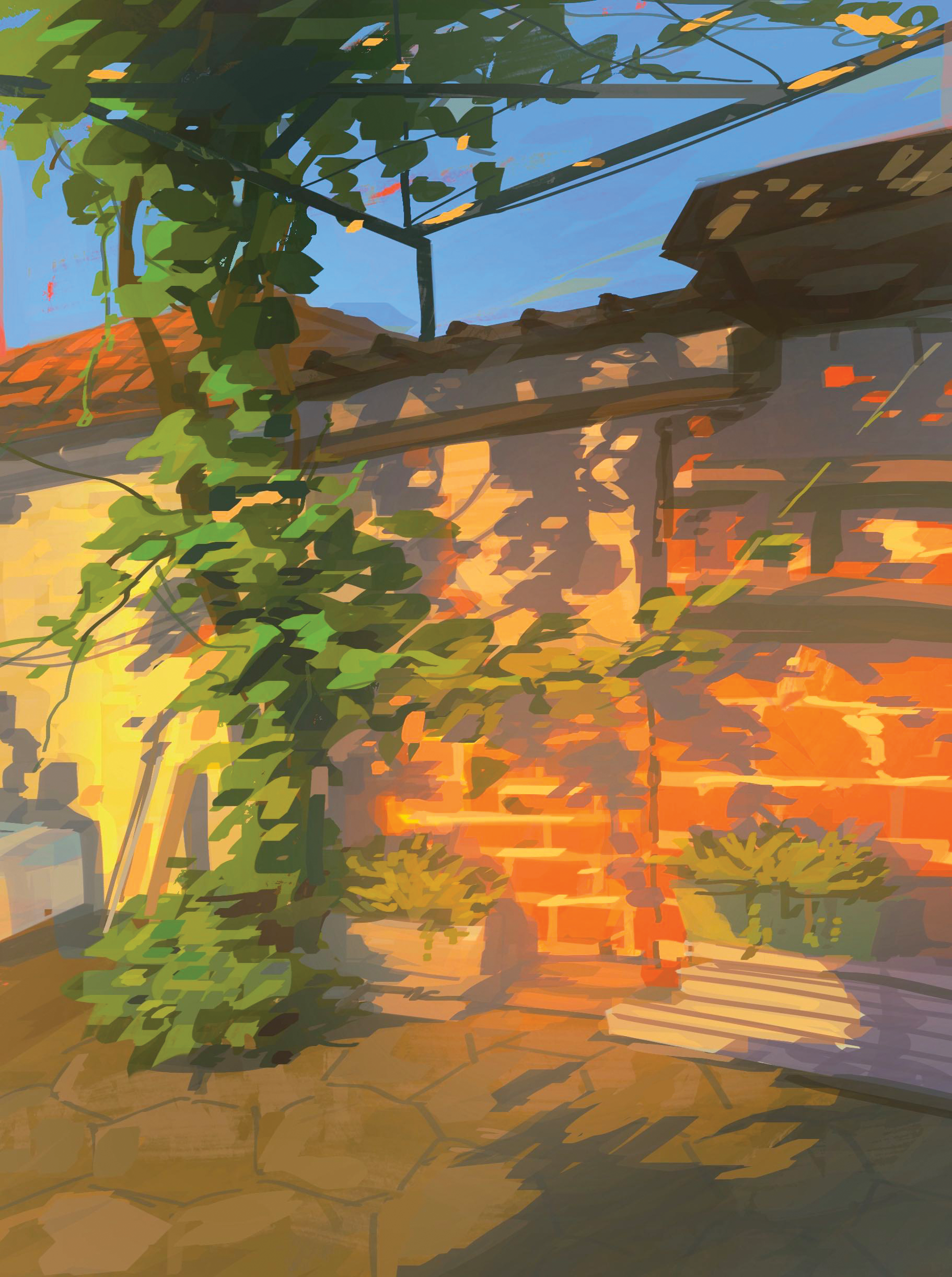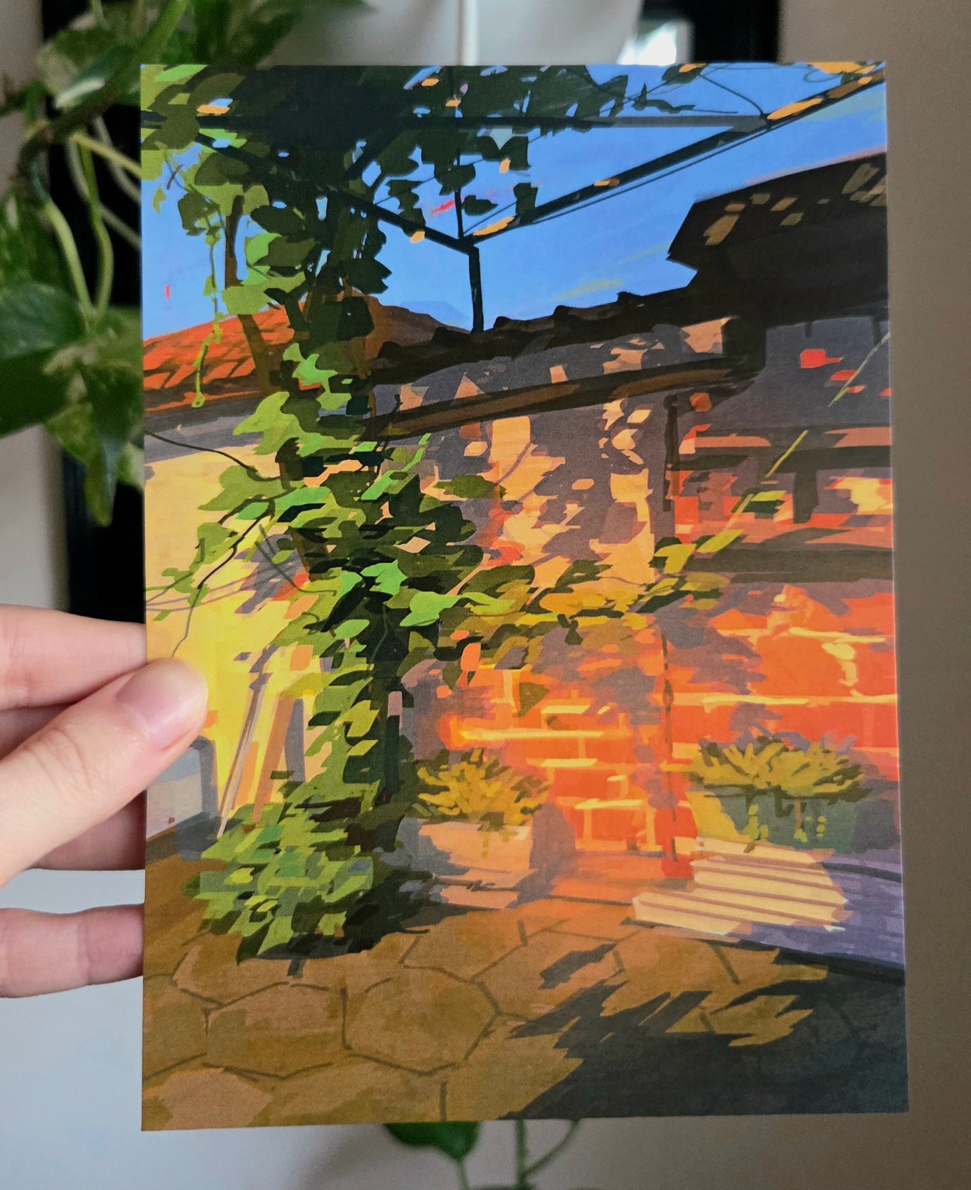 My grandma thinks her backyard in Bulgaria is ugly, but I love the character of grapevine against old clay roof tiles. This digital pleinair piece is printed with a vibrant satin finish and is the perfect addition to any wall!